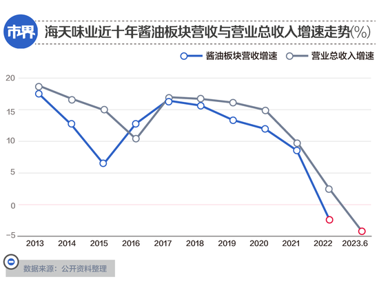 以酱油板块销量为例,从2018年的187.8万吨,一路涨至2021年的266万吨,但到了2022年,只卖出250.2万吨,出现上市以来的首次下滑,并且也是十年来增速下滑最为严重的一年。