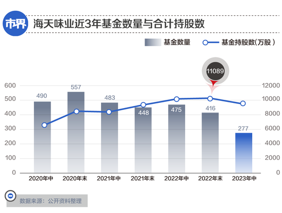 东财Chioce数据显示,在2020年末的巅峰时期,海天味业一度聚集高达557支基金,且合计持有8478万股份,到了2021年年中,伴随着海天味业的股价下滑,基金数量也减至483支,所持股份同样降至8106万股。但随后,海天味业的基金数与持股数开始上升,并在2022年再度下滑,今年年中更是减至277支。