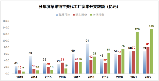 我们看中国苹果链三大龙头,立讯精密、歌尔股份、蓝思科技,在苹果还是他们绝对主导客户的2021年,立讯精密的资本开支高达126亿元,歌尔股份和蓝思科技70亿左右,这个数字基本上相当于他们年净利润的2倍。