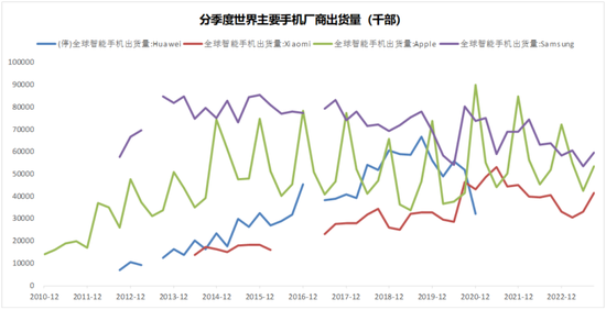 当然这个出货量数据也蛮有意思,华为出货量掉头向下,三星整体影响不大,苹果当然有所提升,小米的出货量看上去增幅更大,2019年3季度小米的出货量只有3270万部,随后一直向上,最高点是2021年2季度,5310万部。