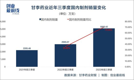 近年来前三个季度,甘李药业的国内制剂销量呈现逐年增长的趋势。其中,2023年前三季度,国内制剂销量为5093.42万支,同比增长70%,较2021年同期大涨131%。
