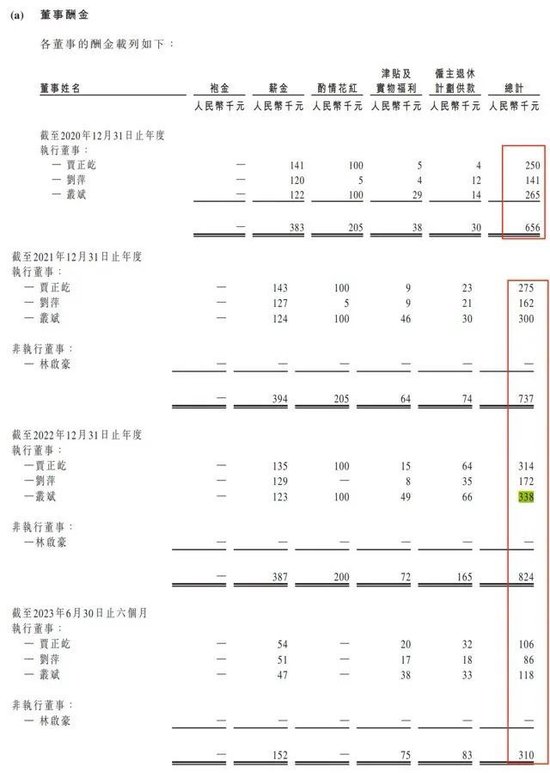 其中,董事会主席兼执行董事贾正屹、执行董事兼董秘刘萍、执行董事兼副总经理丛斌合计分走了65.6万元、73.7万元、82.4万元、31万元。