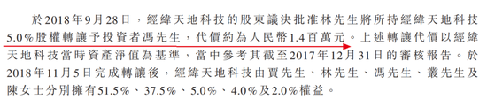 20余天以后,林启豪又将经纬天地科技5%股权转让予投资者冯文翰,代价140万元。