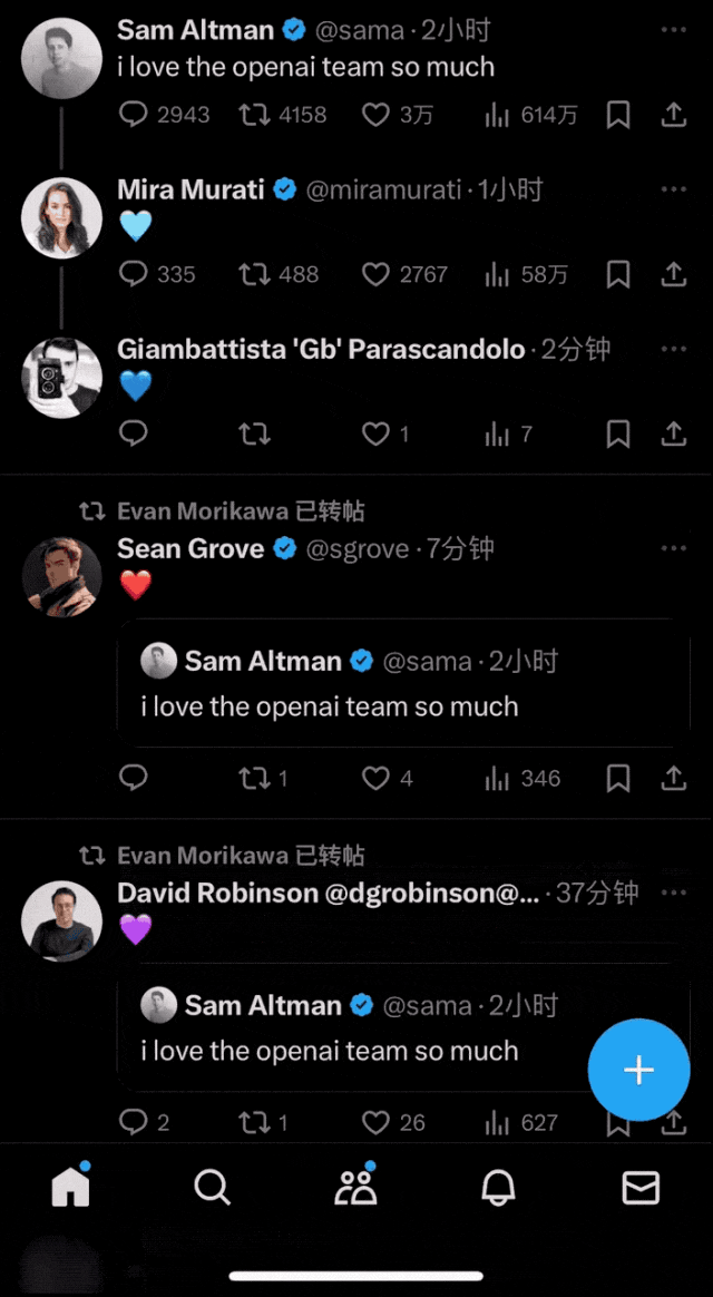 昨天中午左右,在曝出董事会要重新谈判的消息不久之后,奥特曼发布了一条“i love the openai team so much”的“神秘推特”——