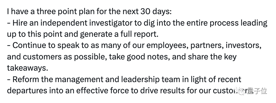 值得一提的是,尽管“临危受命”,Emmett Shear已经为未来30天制定了一个三点计划,其中包括: