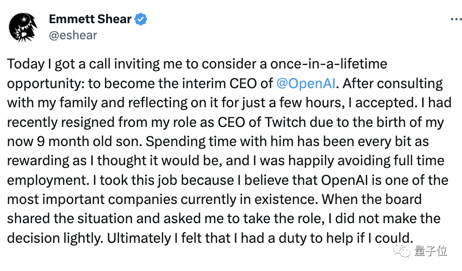 最后,Emmett Shear也最新发了一篇很长的推文,文中写道:自己也是今天才接到董事会的邀请电话,在与家人商量并思考了几个小时后答应了。