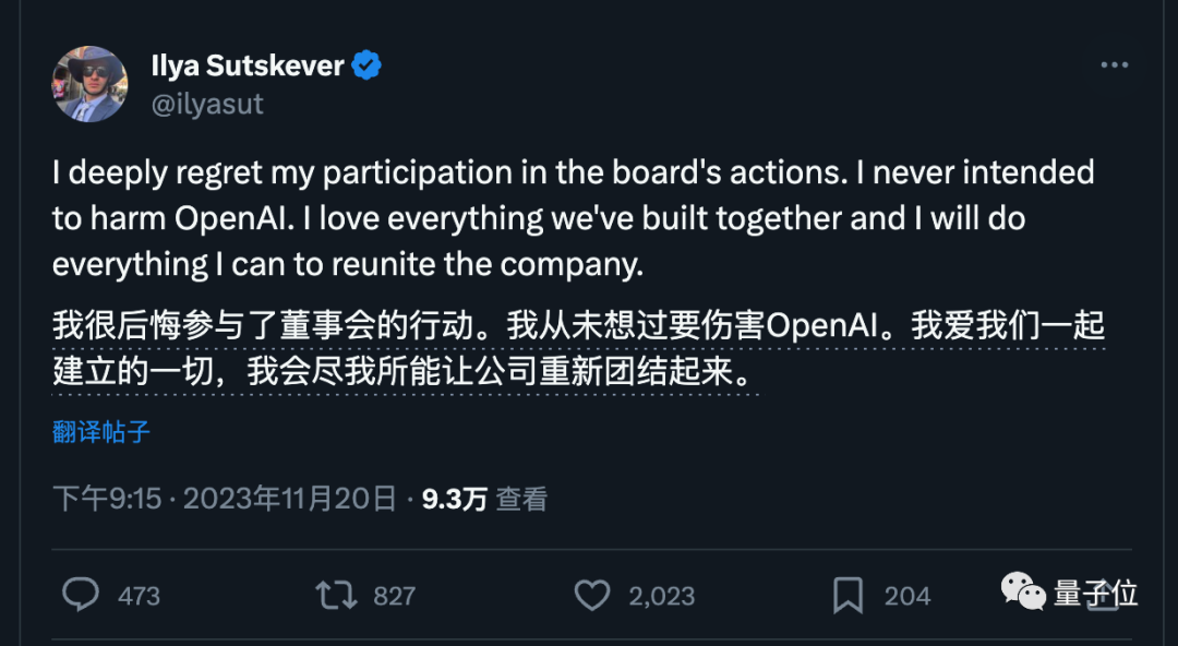 “我很后悔。我从没想过要伤害OpenAI。我将尽我所能让公司重新团结起来。”