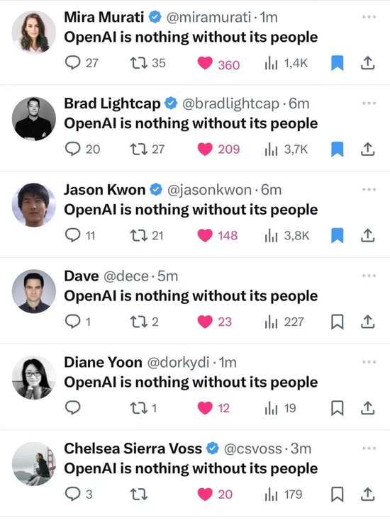 先是数个OpenAI的员工都在整齐划一地发布同一句话:“没人,OpenAI啥也不是。”其中还包括才做了两天临时CEO的米拉·穆拉蒂(Mira Murati)。