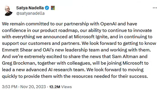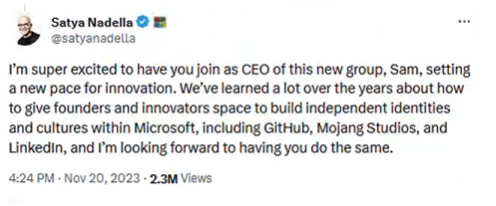 在媒体公布消息后不久,纳德拉就跳将出来,宣布了阿尔特曼和布洛克曼双双加入的消息。这更像是阿尔特曼的一次表态:这个CEO,也不是非当不可。