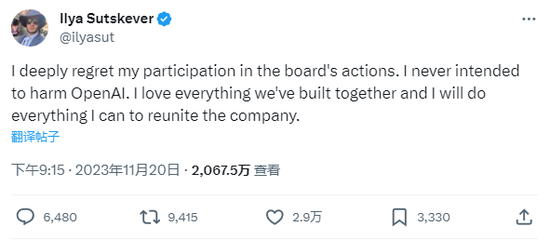 出人意料的是,董事会成员之一、本次董事会“奇袭行动”的出头鸟、OpenAI首席科学家伊尔亚·苏茨克维(Ilya Sutskever)的名字也赫然在列。旧金山天还没亮,苏茨克维在X平台发了条贴文,言语中满是忏悔。