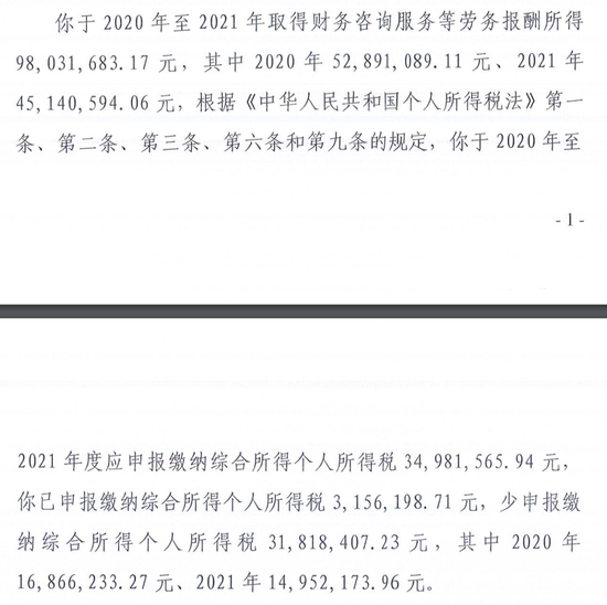 具体而言,张浴波于2020年获得财务咨询服务费等劳务报酬所得5289万元,2021年获得4514万元。根据个税法相关条例,张浴波2020年至2021年度应申报缴纳个税3498万余元,减去实际缴纳的315万余元,总共少缴纳个税3182万余元,其中2020年1687万元,2021年1495万元。