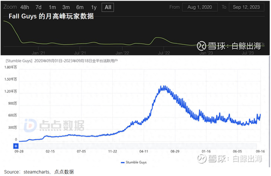原因是,休闲游戏通常操作简单,玩法相对单一,玩家尝鲜后,很容易热情减退。可以看到,《糖豆人》《stumble GUYS》等都是在短时间内塑造热度巅峰后,出现热情滑坡。