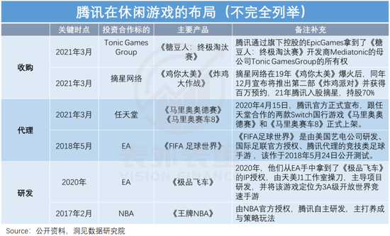 比如,大火的派对游戏《糖豆人》、百万人预约的《炸鸡派对》都有腾讯投资;此外,在体育类等赛道上,腾讯还参与了《NBA 2K》《EA Sports FC》等力作的开发与发行。