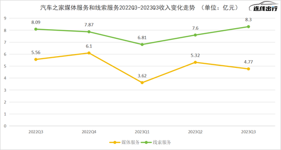 汽车之家媒体服务和线索服务2022Q3-2023Q3收入变化走势,数据来源于公开数据,连线出行制图