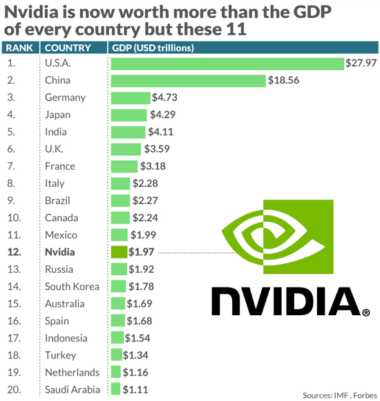 一夜之间,英伟达市值暴涨2770亿美元,创下华尔街单日最大涨幅的历史记录。如今,英伟达的市值已经逼近2万亿美元。以国内生产总值计算,英伟达市值超过了大多数其他国家经济体的规模。