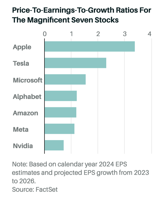 《巴伦周刊》使用基于FactSet预测的2023年至2026年预期平均盈利增长,以及基于2024年预测的市盈率,对美股7大巨头企业的PEG比率(市盈率除以盈利增长率)也做了预测,英伟达是其中最低的。