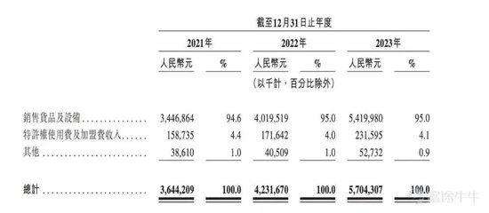从收入构成上看,茶百道收入分为向加盟商销售货品及设备、向加盟商收取特许权使用费及加盟费、其他收入三部分。最近三年,茶百道约95%的收入来自向加盟商销售货品及设备。