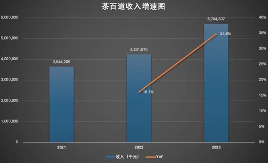 据招股书显示,2021年至2023年,茶百道的营收分别是36.44亿元、42.32亿元、57.04亿元。2022年和2023年,营收分别保持了16.1%和34.8%的同比增速。