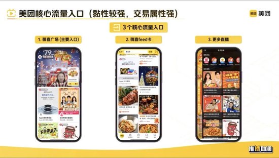 从目前美团给到的流量入口来看,直播间推送的位置主要有三处,其一是美团的首页有一个直播小窗,点击后可以进入猜喜广场,其二是首页的信息流中,其三是在美团细分业务二级栏目内,有对应的直播入口。