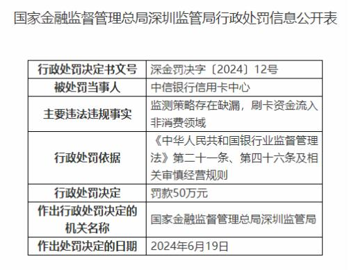 到近日,国家金融监督管理总局网站发布的行政处罚信息公开表中显示,因监测策略存在缺漏,刷卡资金流入非消费领域,国家金融监督管理总局深圳监管局对中信银行信用卡中心罚款50万元。