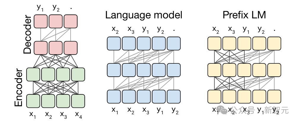 它的一个变体是Prefix语言模型,或者说是PrefixLM架构,它们做的事情几乎一样,除了交叉注意力机制这一点不同之外。(以及其他一些小细节,如encoder/decoder之间共享权重,以及不存在encoder瓶颈)