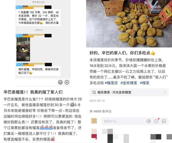 不少消费者抱怨辛巴带货榴莲后市场价变贵