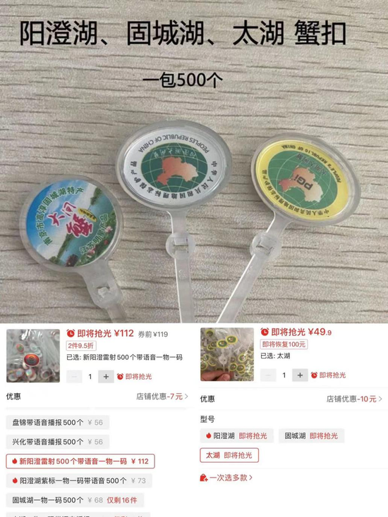 随后锌刻度也在电商平台上搜索发现,阳澄湖、太湖、固城湖的大闸蟹蟹扣都在明码标价地售卖,普通版本均价49.9元/500个,新版带镭射和语音的蟹扣112元/500个。