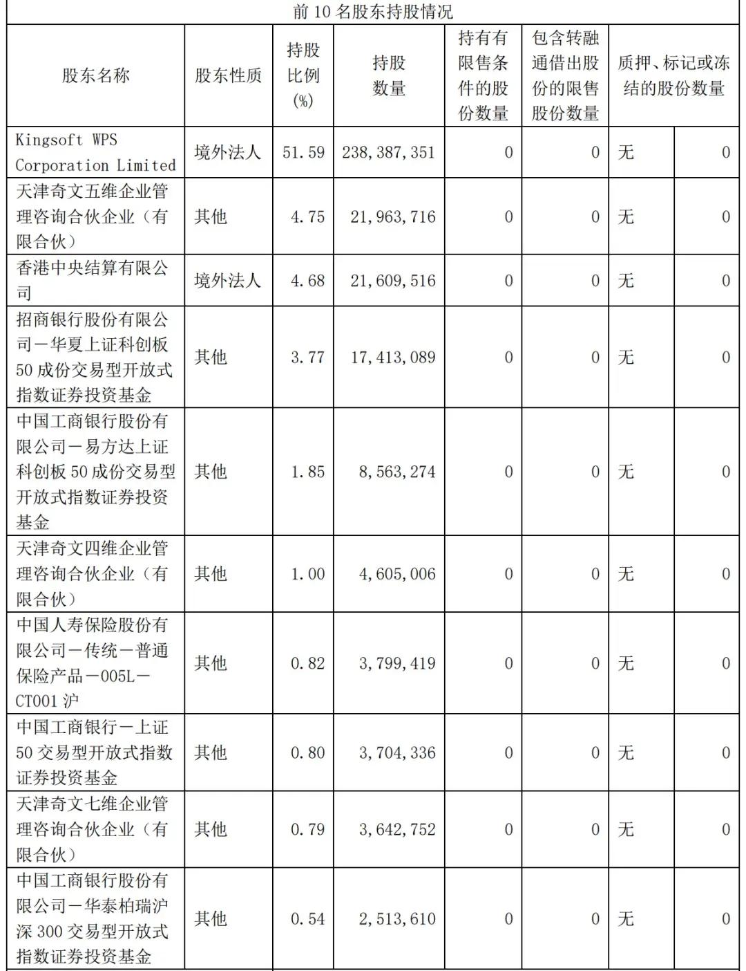 金山办公其他股东包括天津奇文五维企业管理咨询合伙企业(有限合伙)持股为4.75%,香港中央结算有限公司持股为4.68%,招商银行股份有限公司-华夏上证科创板50成份交易型开放式指数证券投资基金持股为3.77%,中国工商银行股份有限公司-易方达上证科创板 50 成份交易型开放式指数证券投资基金持股1.85%;