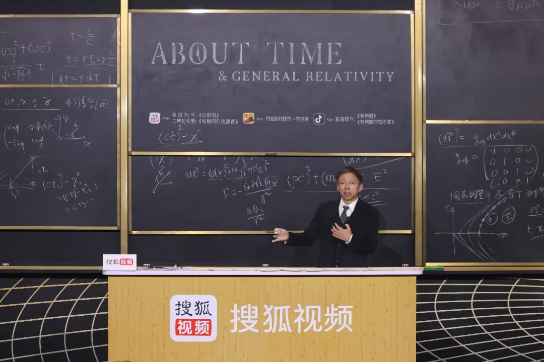 去年首次跨年演讲中,张朝阳从广义相对论探索时间的真相,几块黑板上写满了他推算广义相对论基本原理和爱因斯坦场方程的过程。