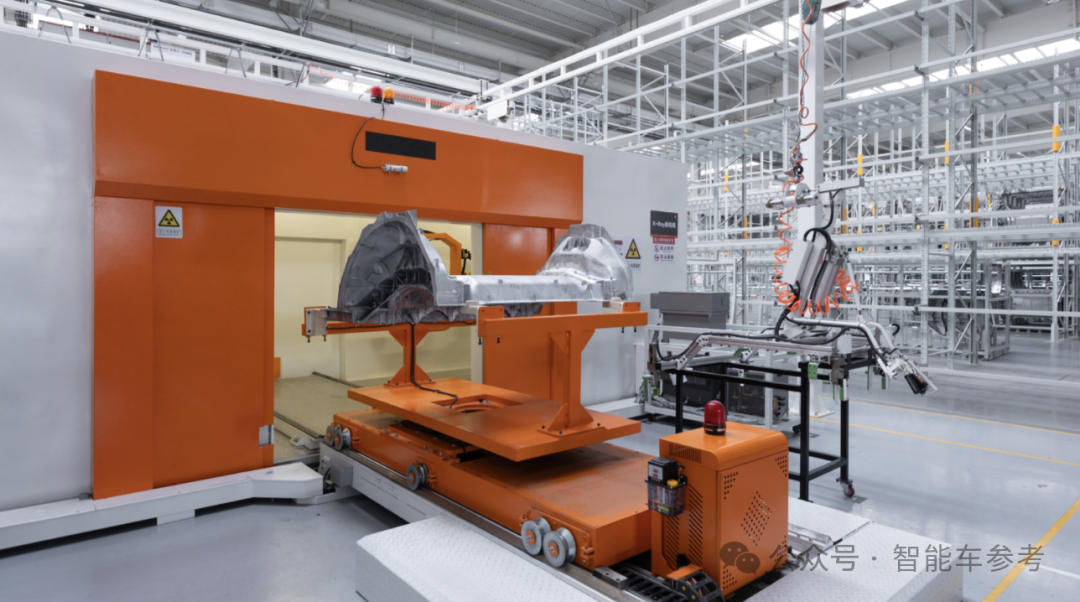 具体来看,厂内有压铸、冲压、车身、涂装、电池和总装、地铺六大车间,引入超700个机器人。