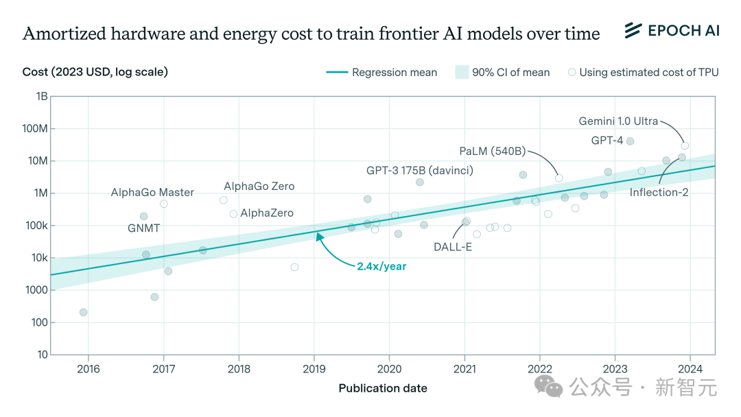 目前存在一个持续的趋势,即各公司在训练强大的AI模型上的投入不断增加,尽管成本曲线会周期性下移,训练特定智能水平模型的成本也在迅速下降。