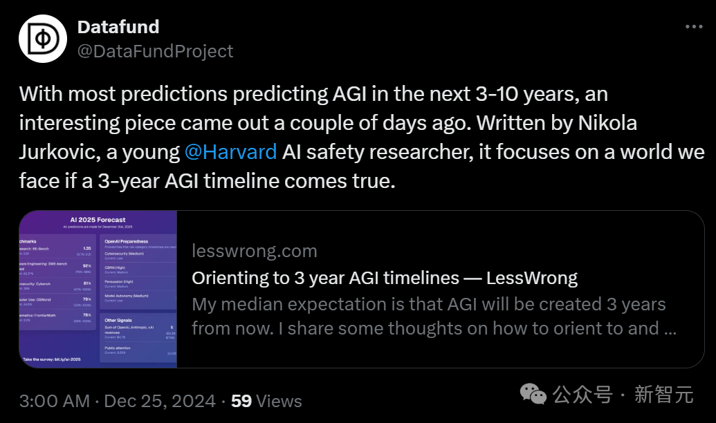 最近,哈佛的一名AI专业大四学生给出了自己的预测:AGI将在三年后实现。