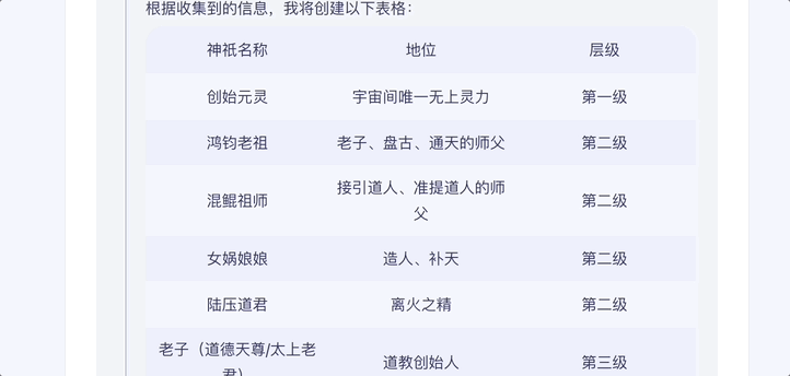 更亮眼的是,如果你觉得这样的查询结果分析起来还是不明了,还可以让它根据从网上搜来的信息,划分主要神祇的层级关系。