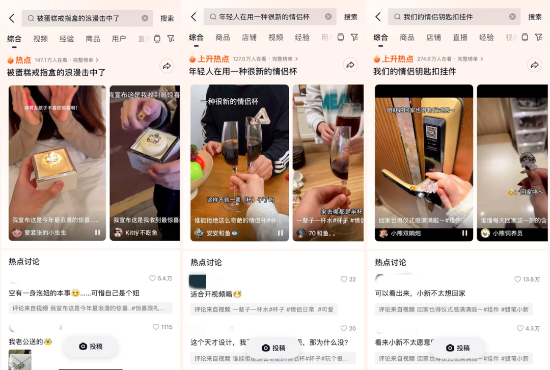 值得一提的是,抖音电商呈现出由趣味性、奇特性与特殊性等类型的小单品引发热点趋势。在# 被蛋糕戒指盒的浪漫击中了 ,#年轻人在用一种很新的情侣杯、#我们的情侣钥匙扣挂件等话题推动下,那些给人带来惊喜与浪漫的小众礼物引发了大量关注。凭借其匠心独运的小单品,诸多商家在竞争激烈的大促中崭露头角,销量直线上升。