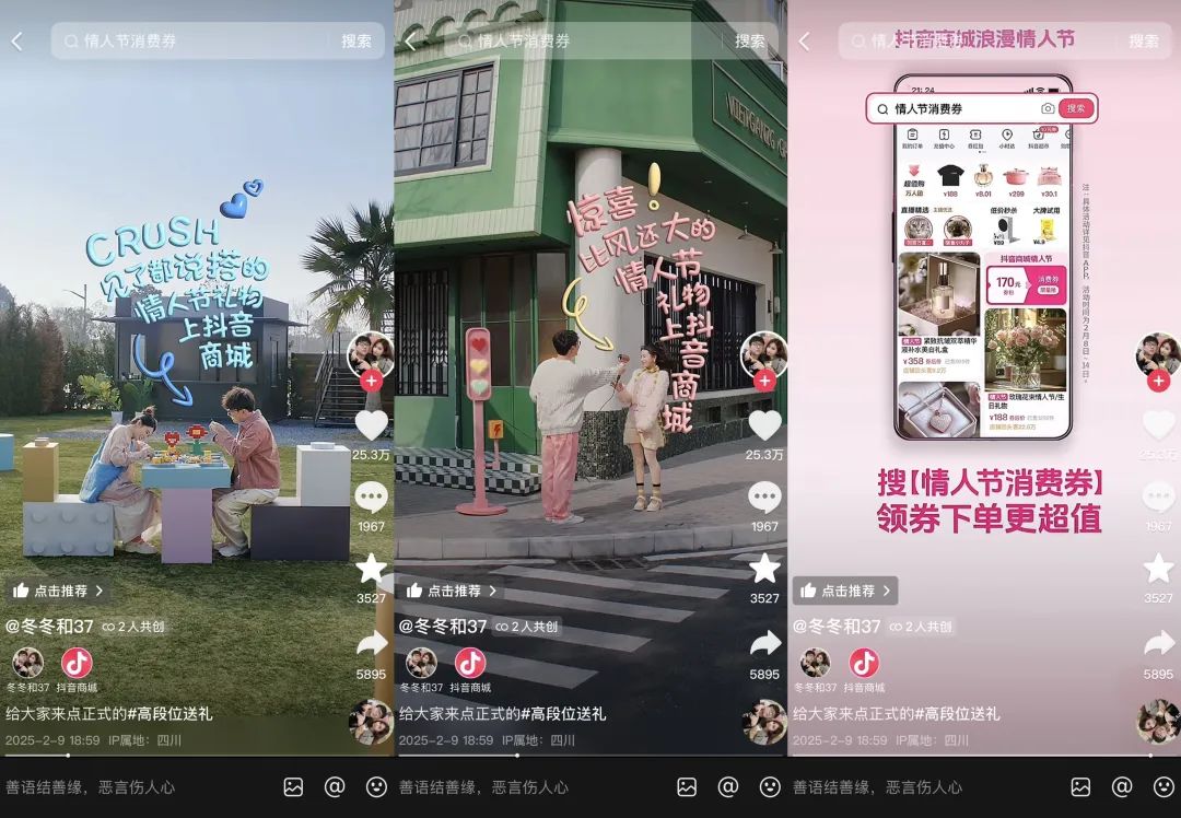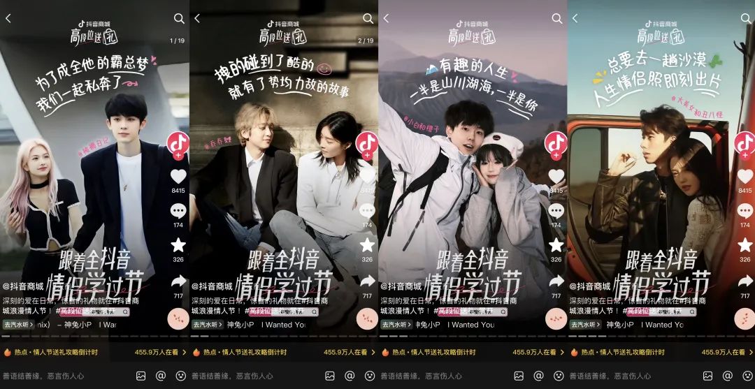 首先一大亮点,是抖音电商巧妙利用情人节的独特情感氛围,邀请情侣达人参与到活动中,创作优质内容,借助情侣之间真挚的情感表达,引起目标受众的情感共鸣,增强用户对情人节送礼文化的认同。