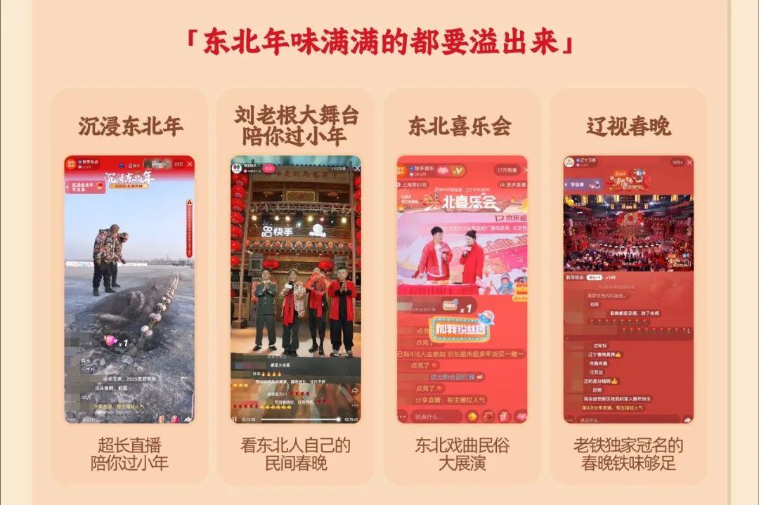 春节期间,你会在快手看到包罗万象的春节内容。这些内容涵盖了大江南北的春节习俗,既有饱含东北特色的辽视春晚、冰面冬捕、刘老根大舞台,还有极具西北特色的秦腔演出、村宴社火等等。当东北冻梨摆盘教程被南方主妇收藏,广东网友跟着直播学包饺子,地域差异就不再是交流阻碍,而是激发全民互动的“文化新通货”。