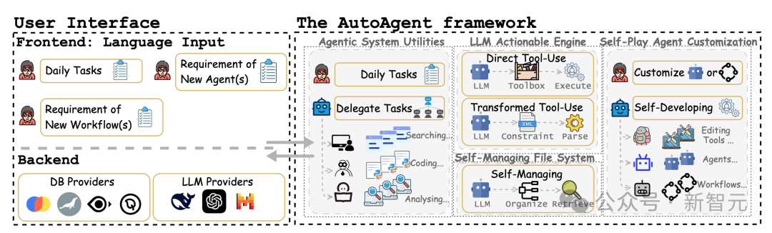 下图展示了AutoAgent的全自动、语言驱动的通用智能体系统。其核心组件包括智能体系统实用程序、由LLM驱动的可操作引擎、自管理文件系统和自博弈智能体定制模块。