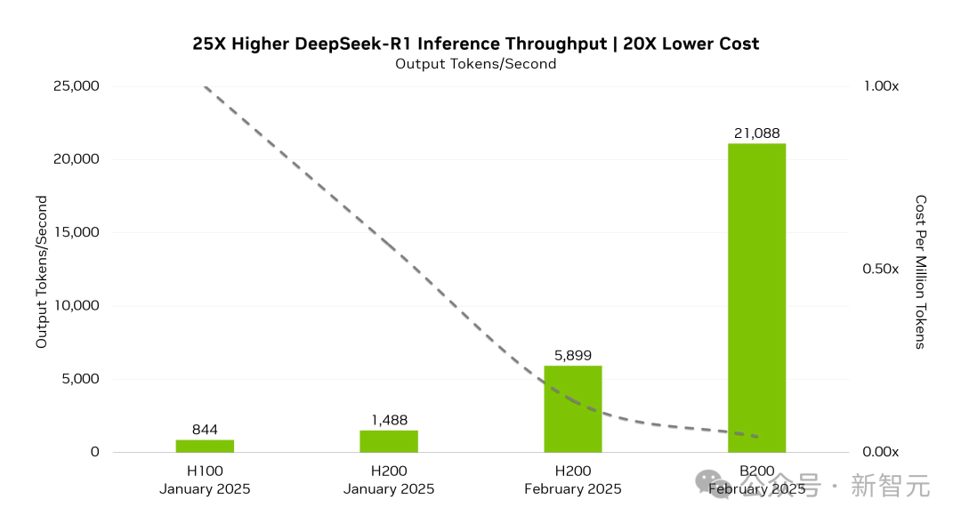 在新模型的加持下,B200实现了高达21,088 token每秒的的推理吞吐量,相比于H100的844 token每秒,提升了25倍。