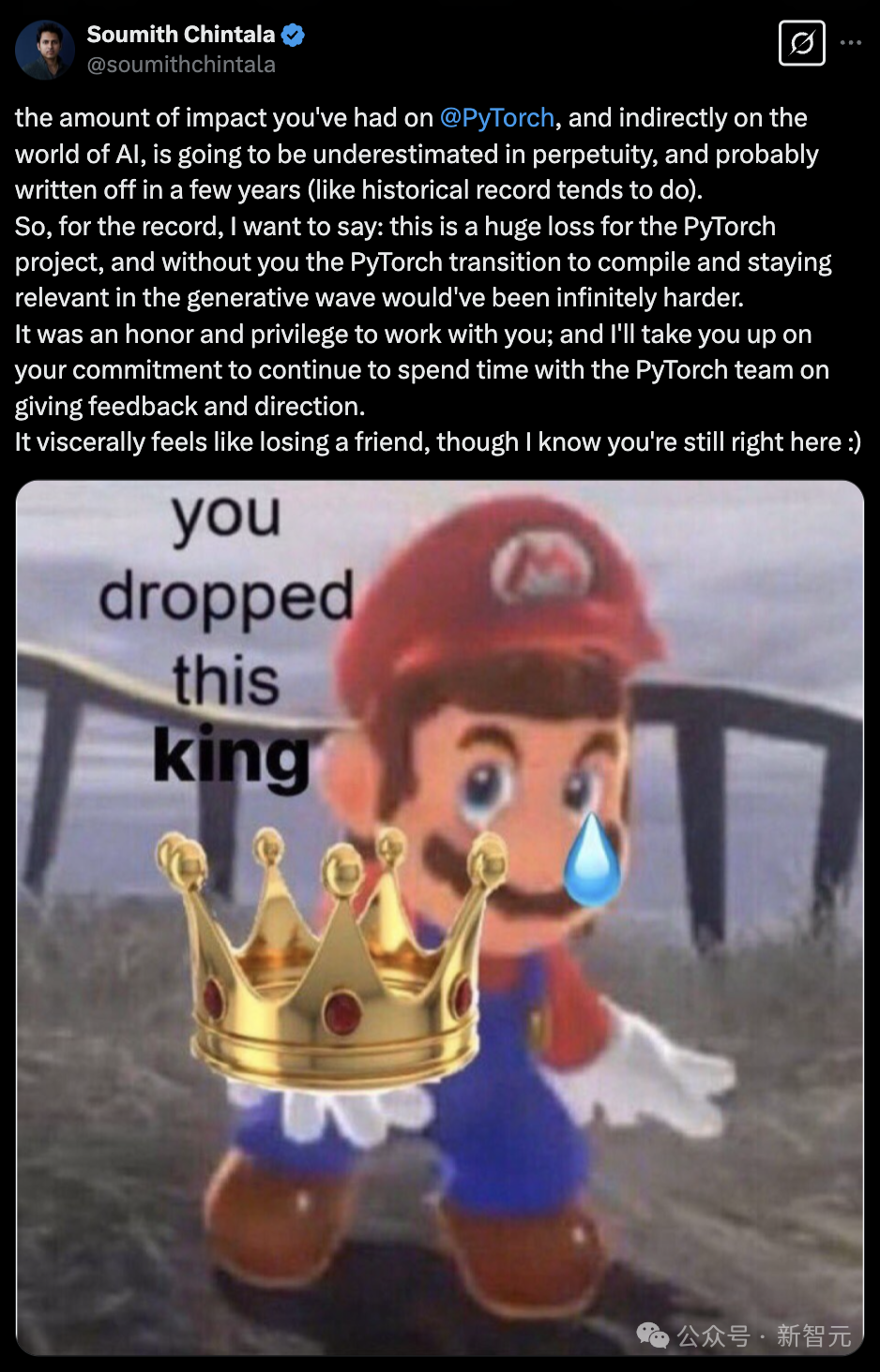你对PyTorch的贡献,以及间接对AI世界的影响,将永远被低估,甚至可能在几年后就被抹去(就像历史记录常常会发生的那样)。所以,我想郑重地说:这对PyTorch项目来说是一个巨大的损失。如果没有你,PyTorch过渡到编译模式,以及在生成式AI浪潮中保持竞争力将会难上无数倍。