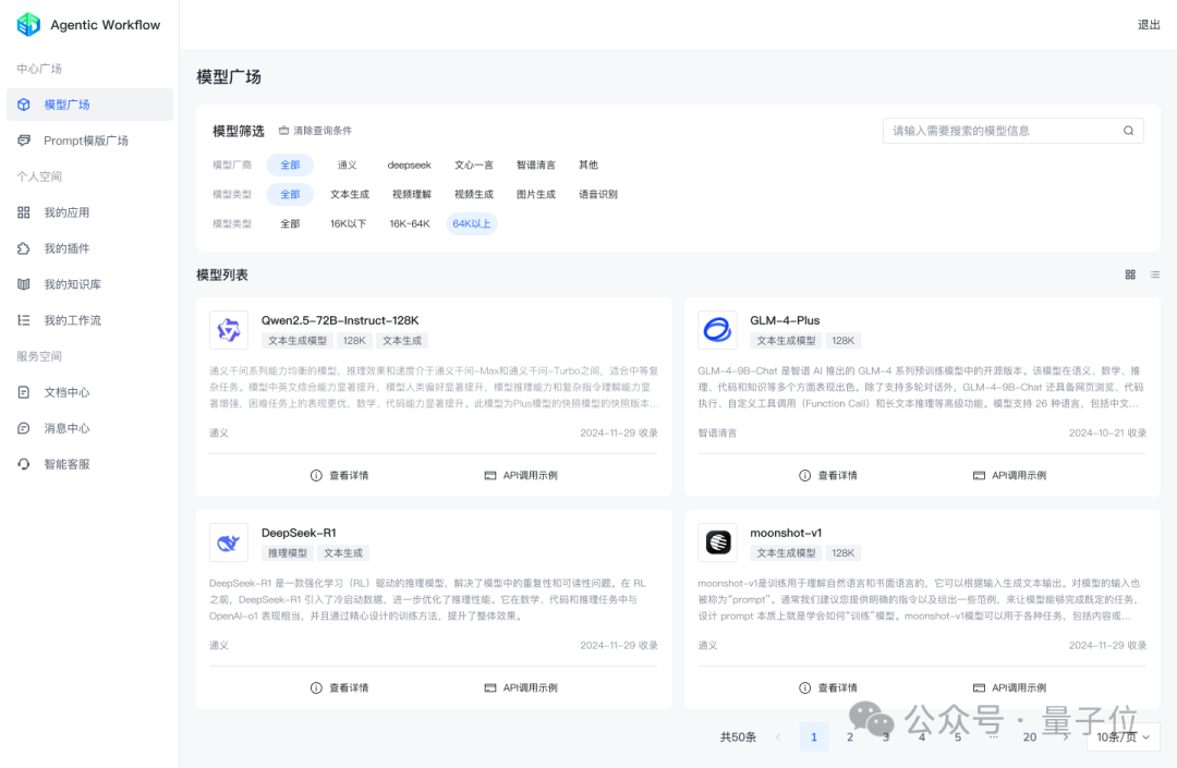 主流模型接入与管理:平台支持无缝切换各种大模型,有Deepseek、Kimi、通义千问等主流大模型,也有私有化模型的接入,并提供API接口接入,开发者能够实现分钟搭建基于多种大模型的工作流应用,将大模型能力快速、灵活地应用到业务场景中,实现业务层和模型层快速灵活的绑定与解耦;