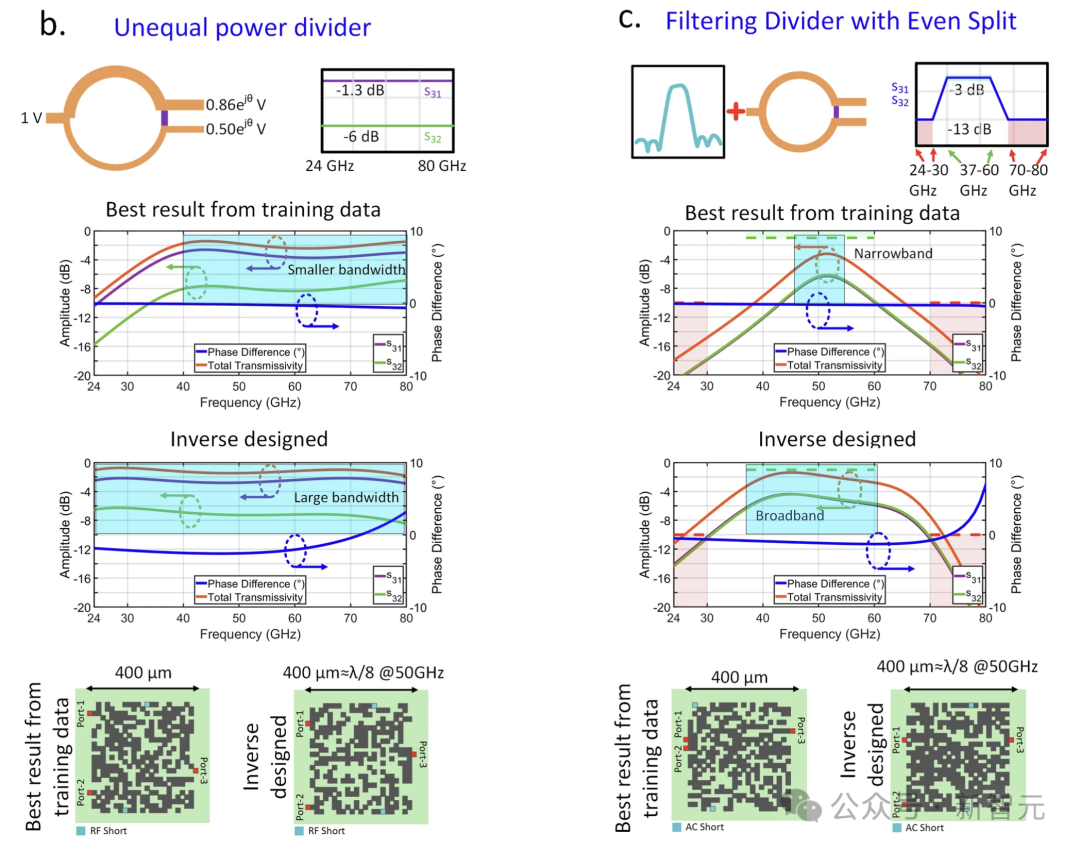 深度学习驱动的高频率电路逆向设计关键点在于,这个CNN模型不仅快,还能泛化。研究人员发现,它能设计出训练数据里没有的结构,比如一个24-80GHz带宽范围内的功率分配器,在带宽、幅度平衡和总传输率上实现了更好的平衡,性能比训练集里的最佳结果还好(如下图b所示)。