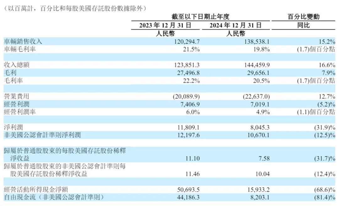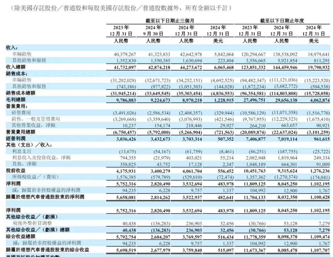 理想汽车2024年的毛利为297亿元(41亿美元),较2023年的275亿元增加7.9%;毛利率为20.5%,而2023年为22.2%。