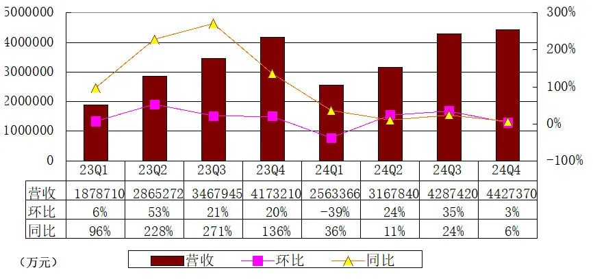 理想汽车2024年第四季度的收入总额为443亿元(61亿美元),较2023年第四季度的417亿元增加6.1%,较2024年第三季度的429亿元增加3.3%。
