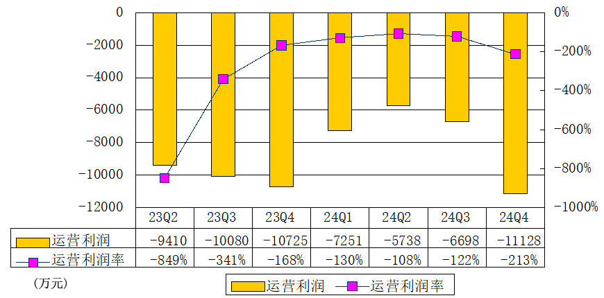 趣店2024年第四季度运营亏损为1.11亿元,上年同期的运营亏损为1.07亿元;趣店2024年第四季度运营利润率为-213%。