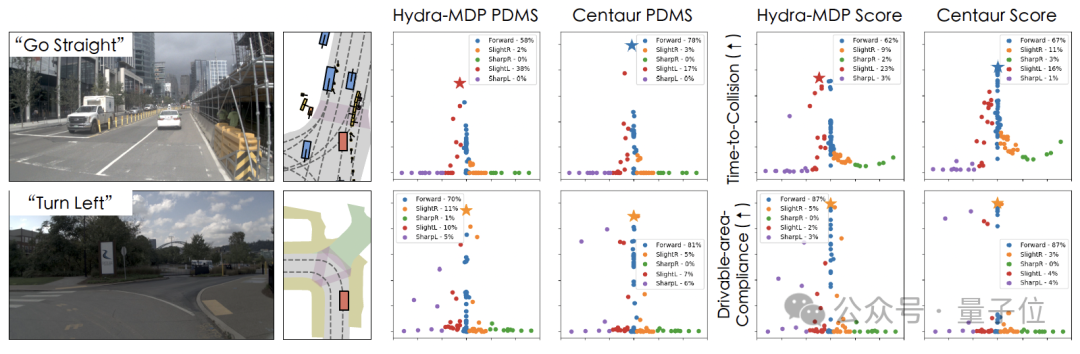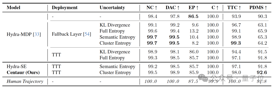 在navtest基准测试中,Centaur的综合规划与驾驶指标得分(PDMS)取得了92.6%的成绩,远远超过了基于回退的方法,并接近人类驾驶水平 。此外,Centaur在碰撞避免和碰撞时间等关键指标上亦表现出卓越的性能。