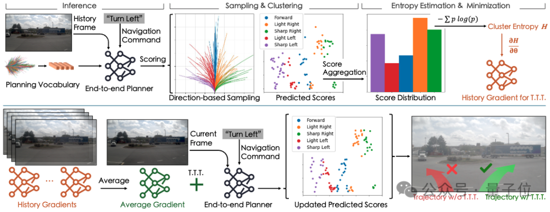具体而言,模型通过计算Cluster Entropy,判断当前环境的OOD级别。如果模型对当前环境的理解较差,则触发TTT训练过程,通过梯度下降对特征提取网络进行小幅度更新,使其更适应当前环境特征分布。这一方法使得Centaur能够在推理时自适应地优化自身,在OOD场景中保持稳定的感知和驾驶能力,而无需依赖固定规则或人工设计的成本函数。