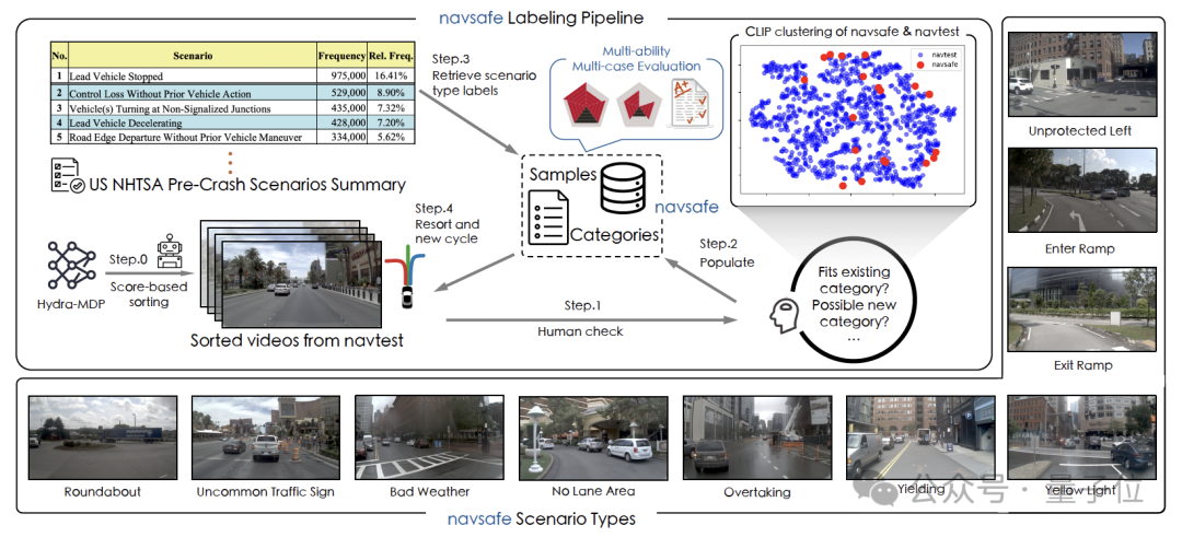 为了更好地评估自动驾驶系统在安全关键场景中的表现,我们提出了navsafe数据集,专门用于测试端到端驾驶方法的安全性和鲁棒性。它基于navtest,并结合了真实的事故数据,通过细粒度的评分机制,量化了自动驾驶模型的不同驾驶能力,而不像navtest 只提供整体分数。