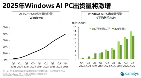 AI PC市场兴起,Canalys预测2025年Windows AI PC市场份额将达到30%,2026年将增长至50%。Luca也曾在采访中表示,AI PC的普及率将在未来两到三年内达到40%~50%,甚至高达80%。