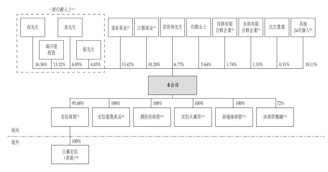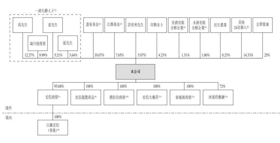 IPO前,高峰控制江苏宏信约29.68%投票权:其个人身份行使约16.36%;及(瑞川达投资行使13.32%。袁原能透过其个人身份行使江苏宏信约6.95%投票权。张佳安能透过其个人身份行使江苏宏信约4.85%的投票权。