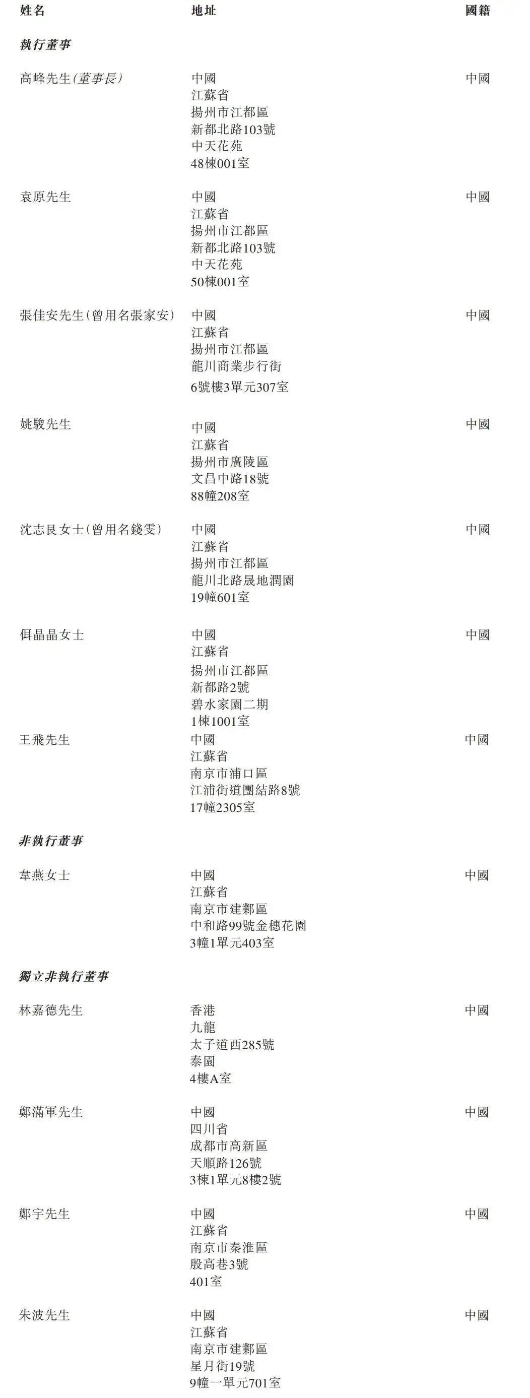 江苏宏信执行董事为董事长高峰、袁原、张佳安(曾用名张家安)、姚骏、沈志艮女士(曾用名钱雯)、佴晶晶女士、王飞;非执行董事为韦燕女士,独立非执行董事为林嘉德、郑满军、郑宇、朱波。